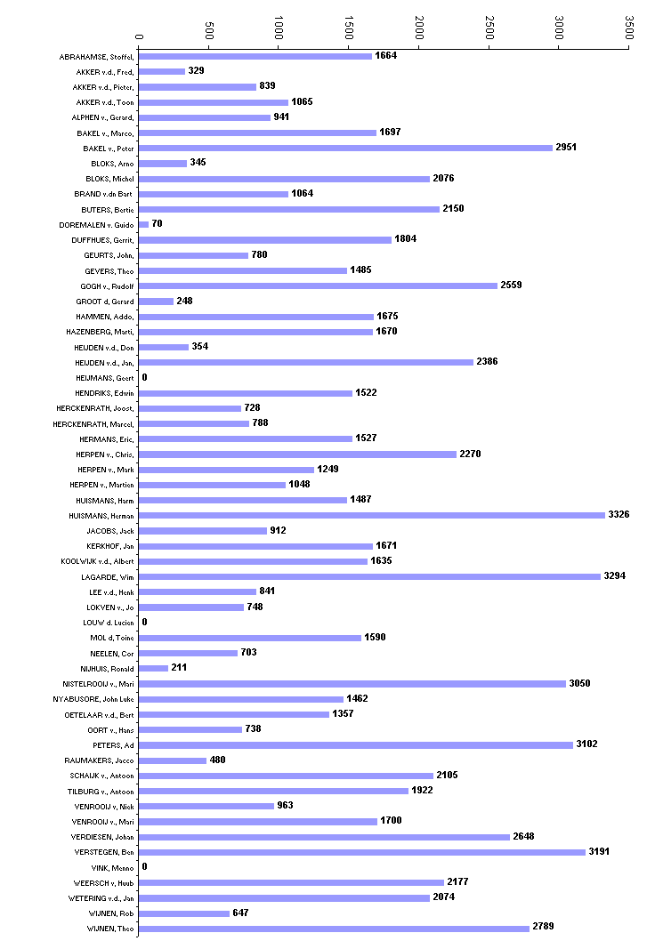 Dit jaar is het Herman Huismans die de meeste clubkilometers heeft afgelegd. Met een voorsprong van slechts 32 Km kwam hij op een eindstand van 3326 Km.