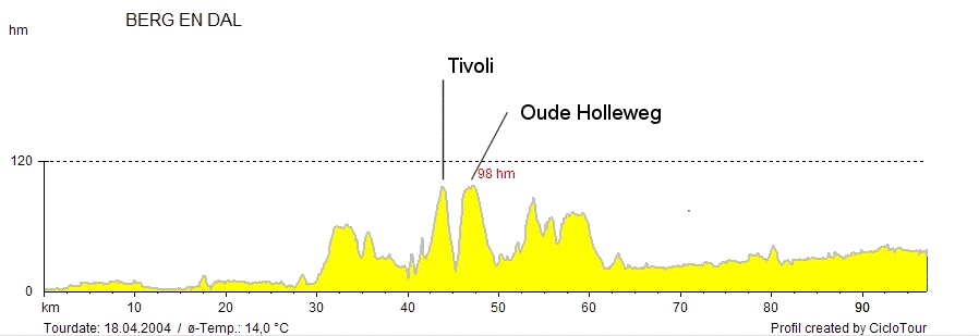Het hoogte profiel van een rondje Berg en Dal op 18 April 2004.